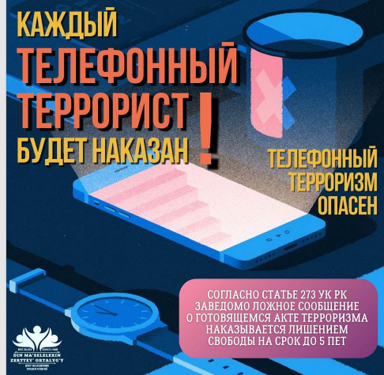 Напоминаем, заведомо ложное сообщение о готовящемся акте терроризма наказывается штрафом в размере до 5000 месячных расчетных показателей либо лишением свободы на срок до 5 лет.