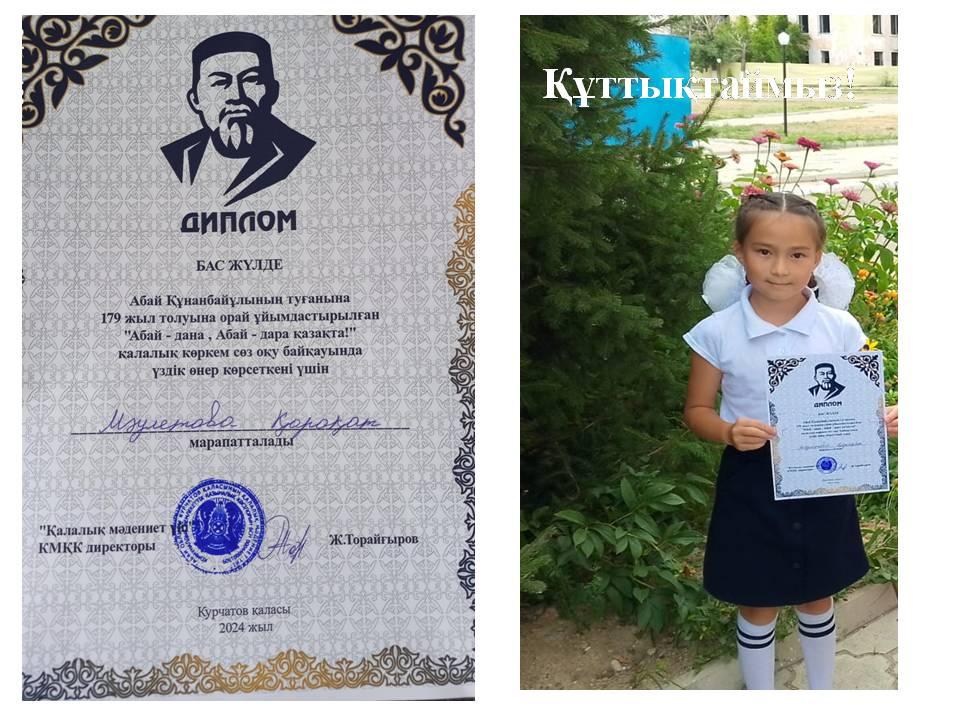 №2 ЖББОМ оқушысы Маулетова Қарақат "Абай-дара, Абай-дана қазақта" қалалық көркем сөз оқу байқауында "Бас жүлде" иеленді. Талабыңа нұр жаусын! Құттықтаймыз!