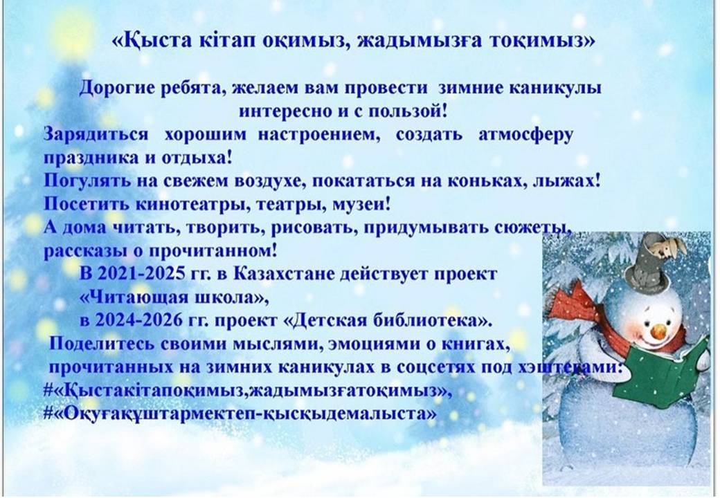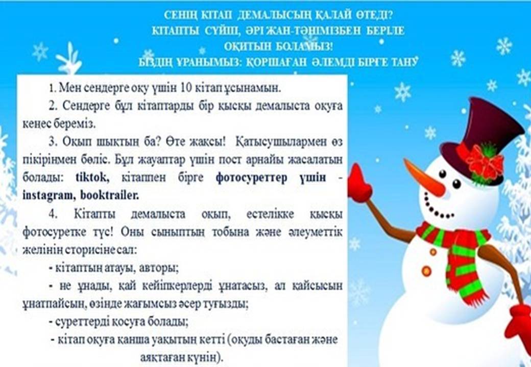 Бізбен бірге кітап қиял әлеміне ұмытылмас экскурсиялар жасауды ұсынамыз. Сіз қысқы демалыс кезінде бізбен достасып, көптеген, қызықты, тартымды іс-шаралармен айналысып, барлық құрдастарыңызға ерекше танымдылыққа толықысқы демалыс 2023-2024 ж. туралы айтасыз деп үміттенеміз!!!