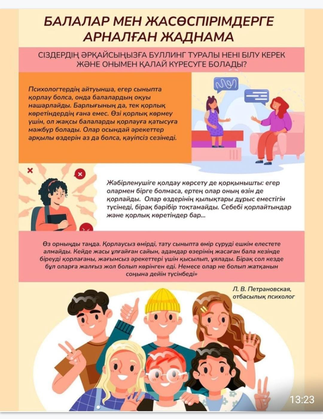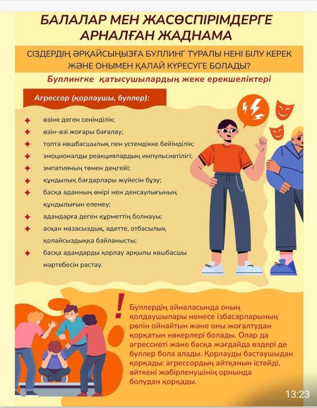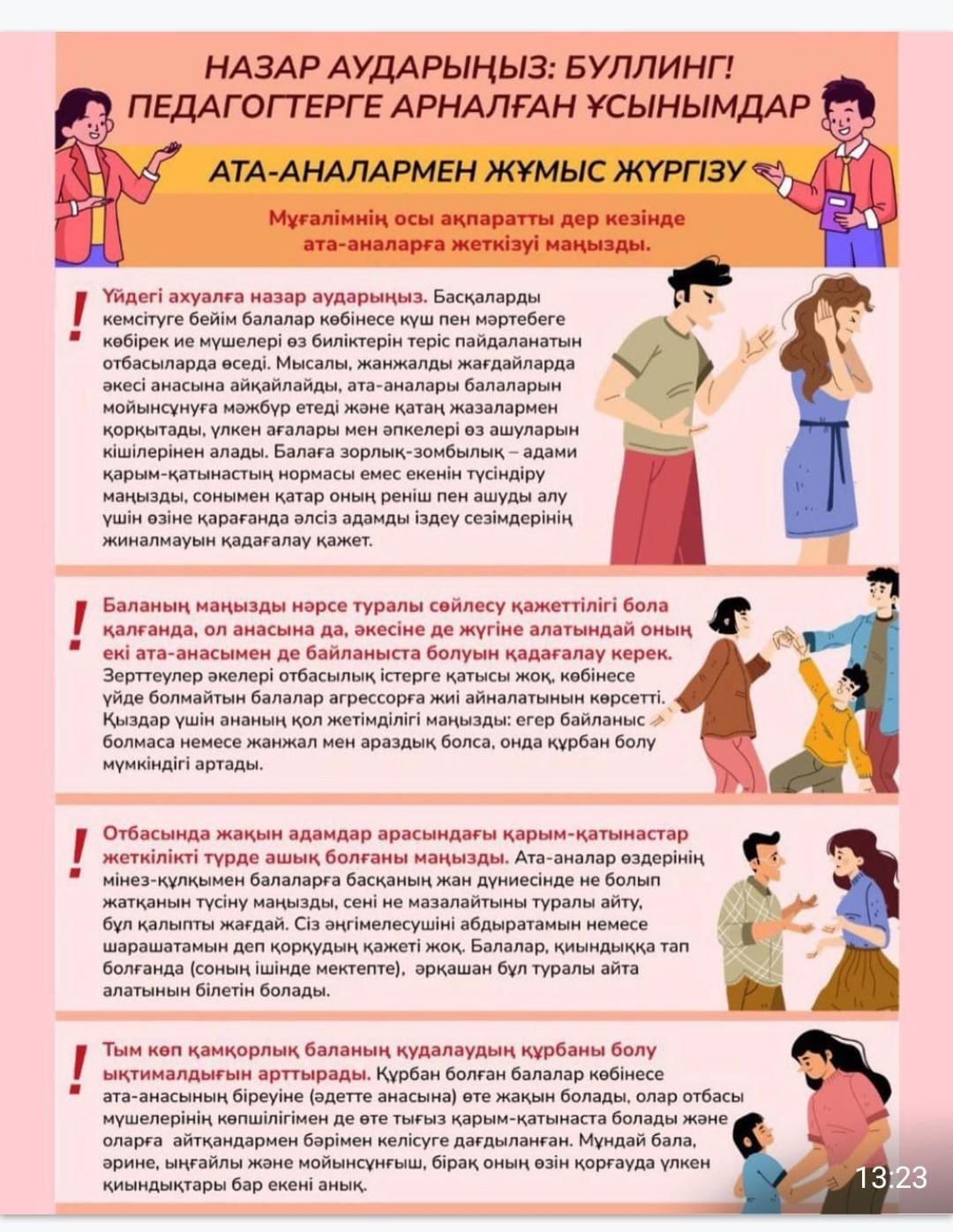 20.01.2025ж. Назар аударыңыз: БУЛЛИНГ! Педагогтерге арналған ұсынымдар. (Кабдыкаримова М.А.)